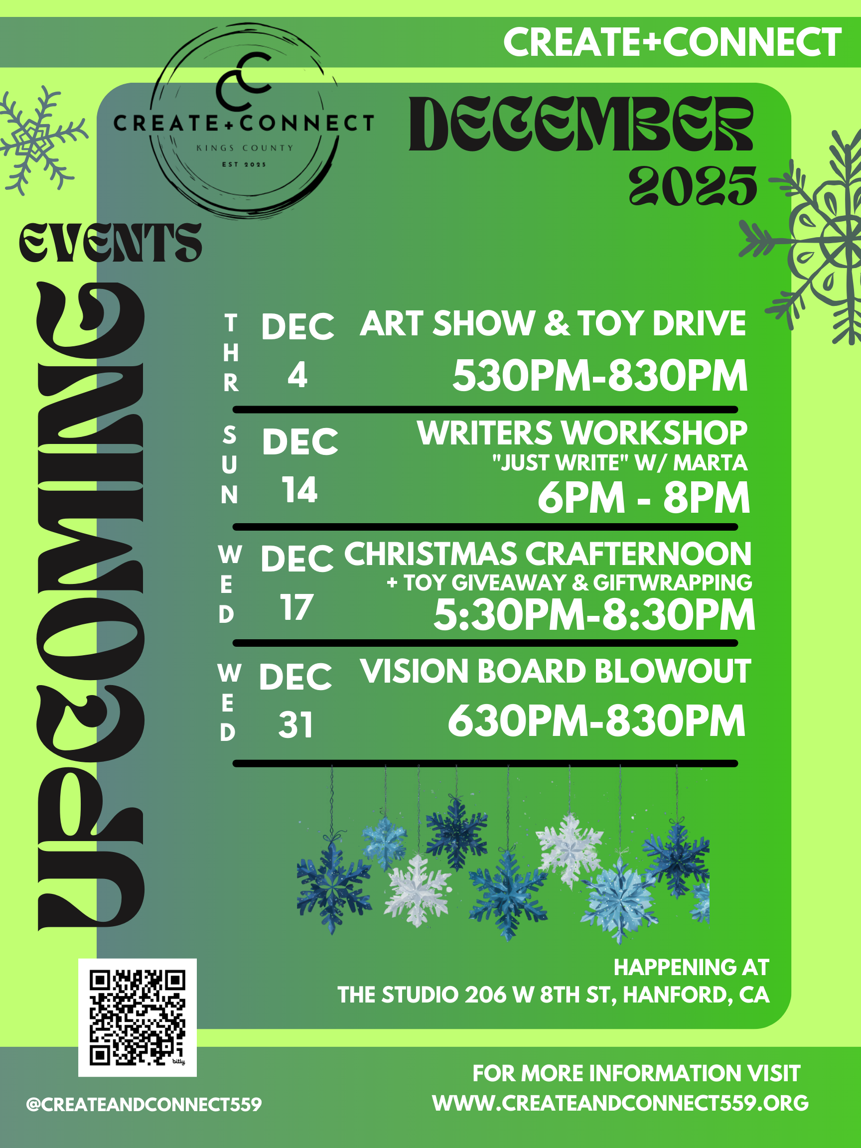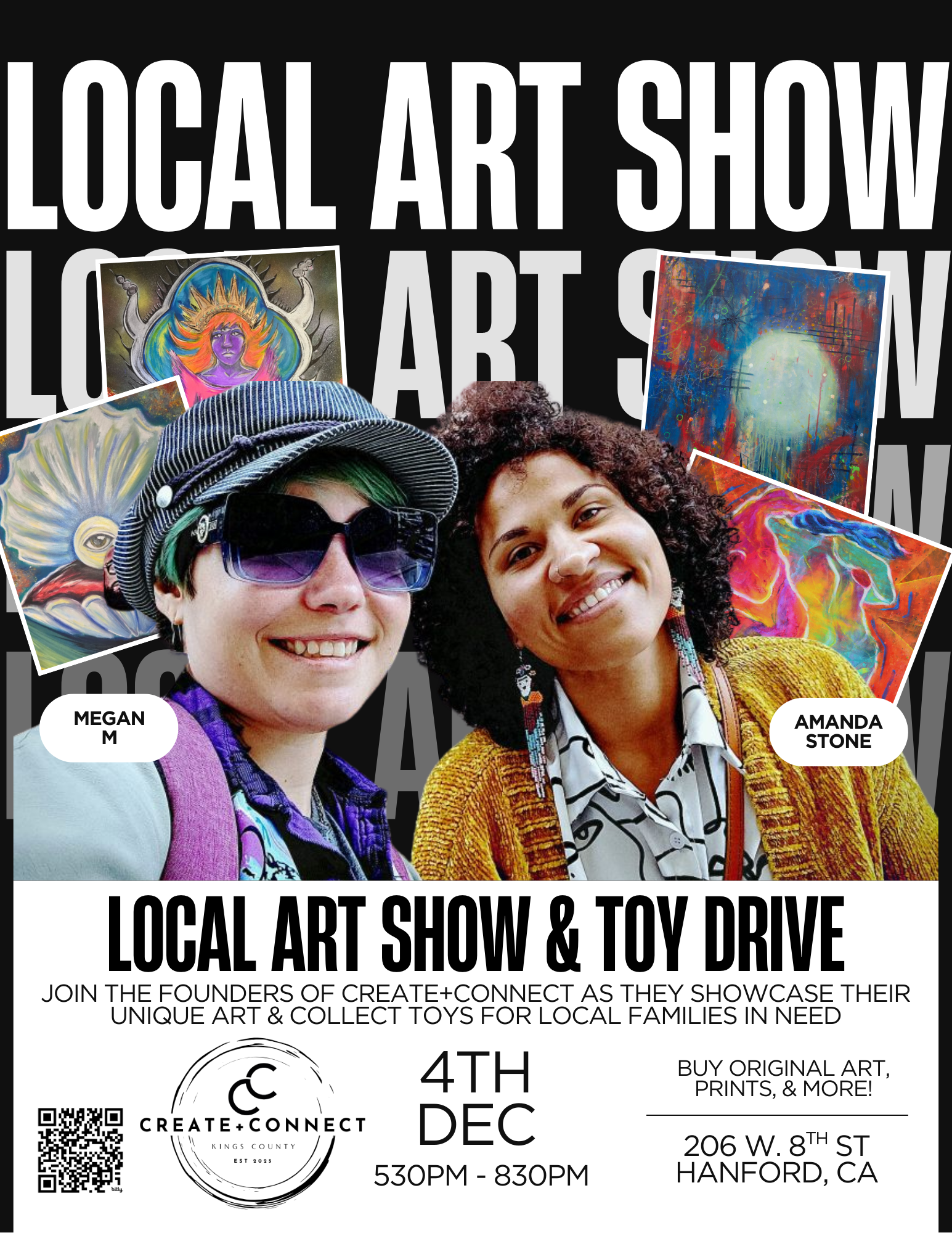 We will also be collecting toys for local families in need, because on Dec. 17th Create+Connect will be hosting a FREE TOY GIVEAWAY and gift wrapping opportunity for families in need to select a toy, wrap it up, and take it home. Donate a new or gently used toy during the art show.